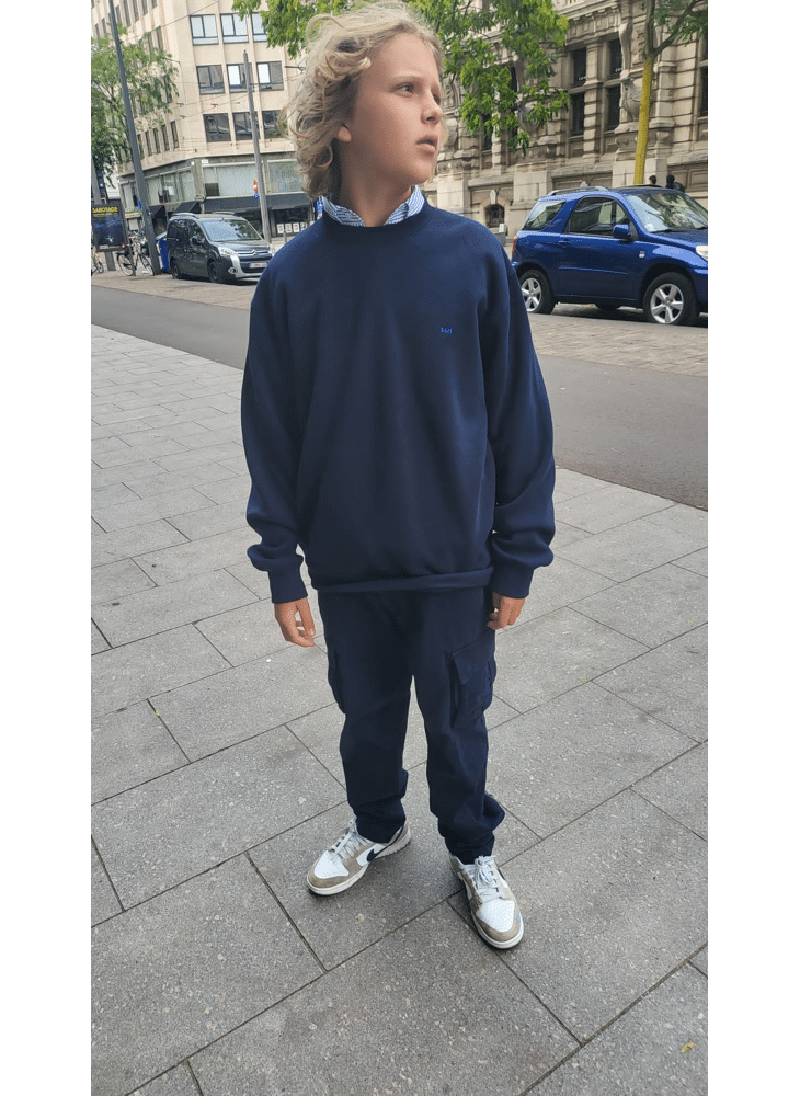 Donkerblauwe sweater met ronde hals (=crew neck) voor leerlingen van het Sint-Ursula-Instituut Onze-Lieve-Vrouw Waver. Er is geen apart meisjesmodel meer beschikbaar.